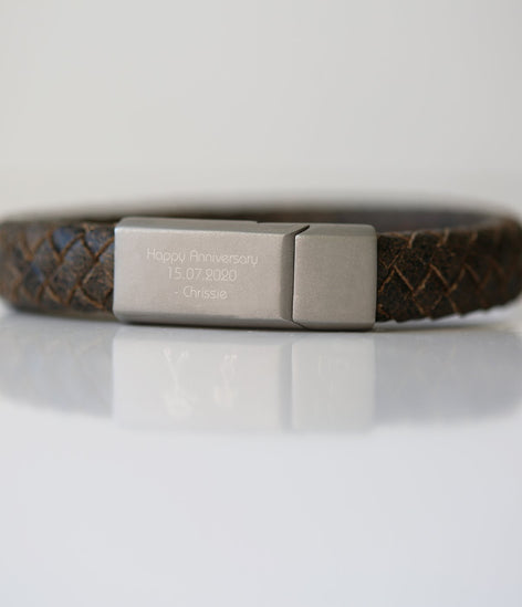 Looking for a birthday gift? or Valentine's present? Or maybe you just want to treat somebody special. Then this engraved bracelet for him is the perfect choice. With genuine leather woven strands and a snap-lock...